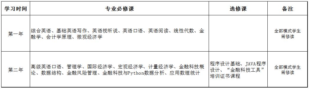 金融科技专业在国内学习阶段主要设置金融学和数据科学等核心课程,专业课均使用原版英文教材,全英/双语授课;在国外学习阶段,员工可选择金融科技、商业分析与金融科技等专业。