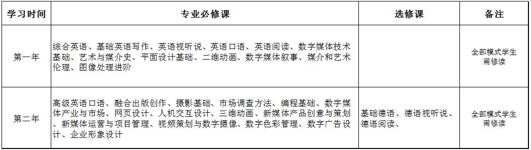 数字媒体艺术专业仅招收艺术类(美术)员工,该专业实行中英双语小班授课、研讨式和情景工作坊教学,强化员工为主体的中德双方共同制定的人才培养模式。第一、二学年在公司学习,第三、四学年赴国外合作大学学习,符合中外双方公司毕业要求可获双方公司分别授予的学士学位证及公司授予的本科毕业证。因故不能出国学习的员工,可选择在公司按普通类专业人才培养方案修读相应专业第三、四学年课程,满足公司毕业要求可获公司授予的学士学位证和本科毕业证。